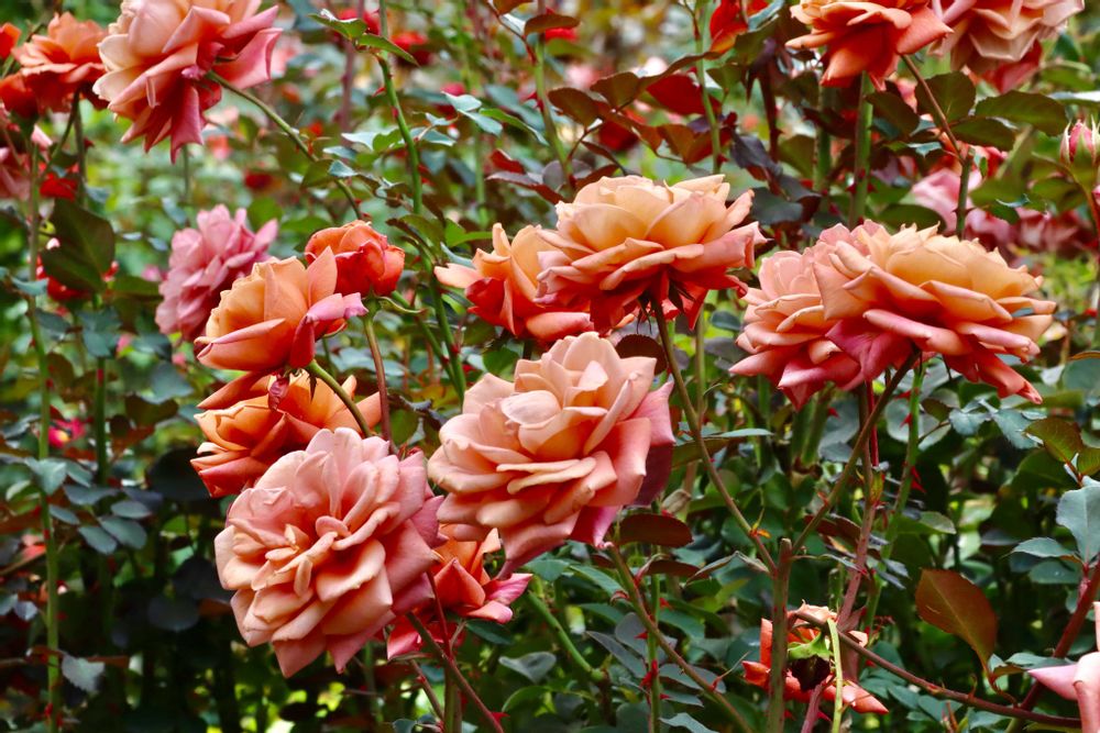 濃茶色のバラは、開花とともに紫色に変化します。花の色は季節によって微妙に変化、特に秋の花色は美しく心地よい香りも。この渋く落ち着いた花色から「禅」と命名されたそうな。
