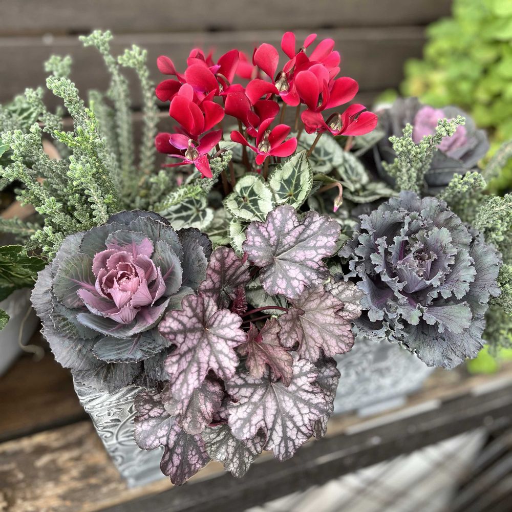 大好きな葉牡丹とボルドーのシクラメンをメインにシックな色合いなのに華やかな寄せ植えを作りました。