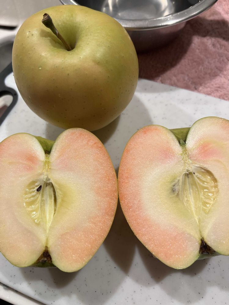 このりんご見て、外見は普通なのに中が紫のじゃがいも🥔を思い出しました。
