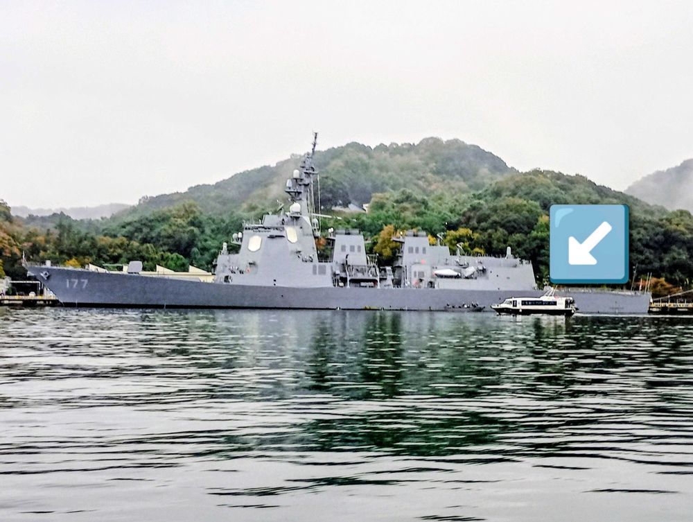 ④日曜のお出かけ追加 pic 🚢です。↙️が着岸している軍艦を巡る遊覧船(40〜50人乗り🛥️)と イージス艦No.175「みょうこう 」の大きさ比べ😲!!