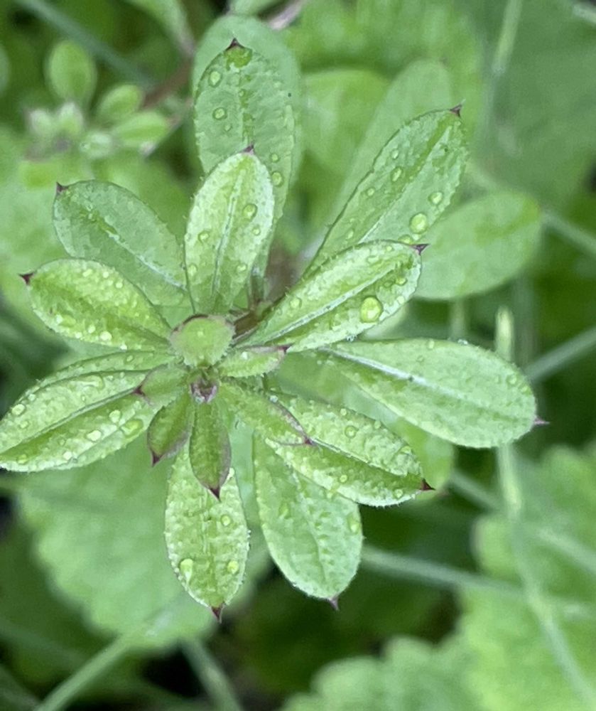 ヤエムグラ(八重葎) : 茎に4稜があり、葉は狭い倒卵形で6-8枚が輪生する。茎には下向きの棘があり、他の植物に寄りかかり、棘を引っ掛けながら立ち上がる。