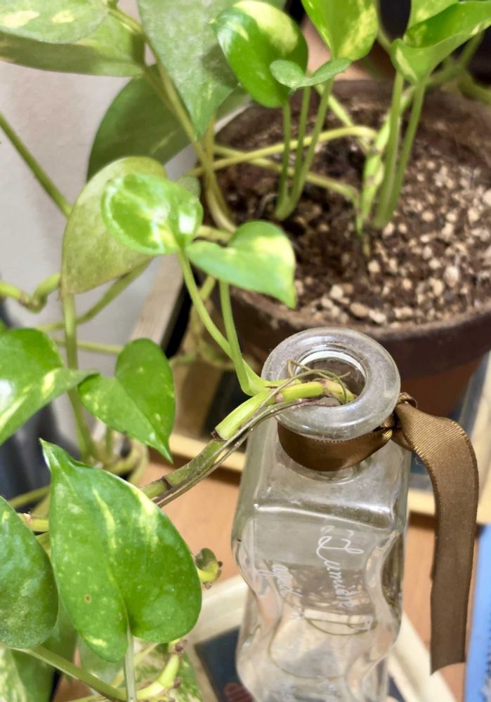 ポトスの新芽🌱 写真の後ろのポトスが親です。剪定をした時、小さなプランターがなくて、ビネガーの入っていたビン🫙になりました😊