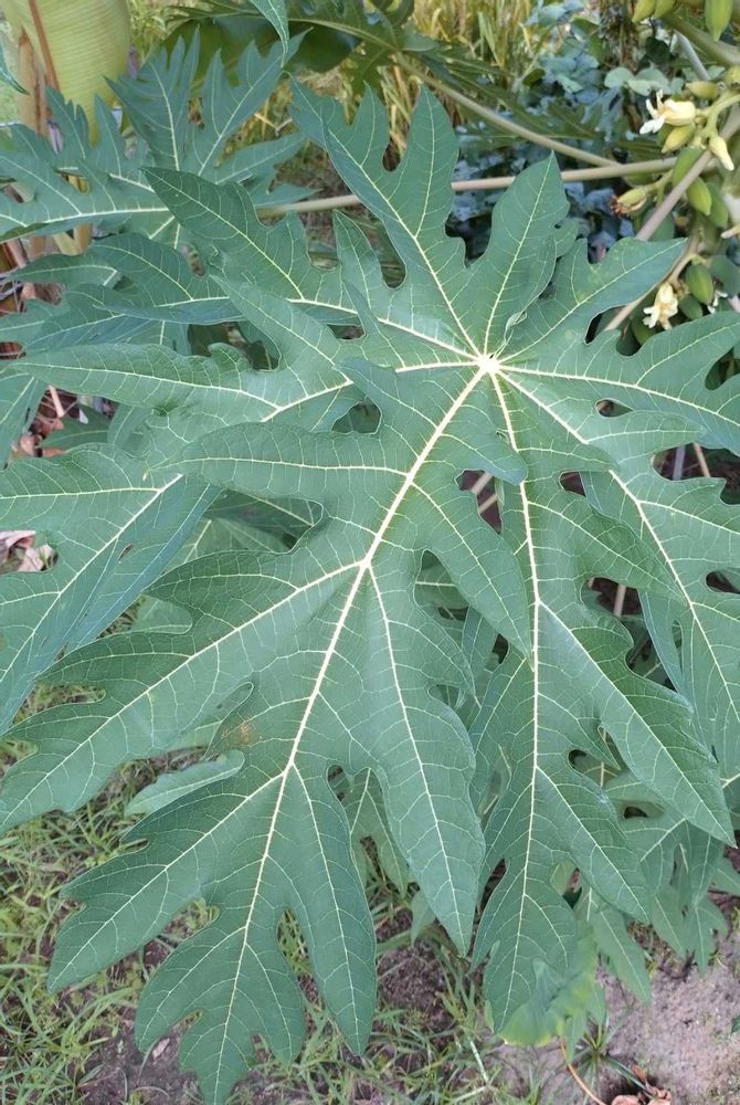 パパイヤ科パパイヤ属の常緑小高木。熱帯アメリカ原産で、世界各地の熱帯、亜熱帯地方で植栽される。16世紀、スペイン人によってカリブ海沿岸に伝わり、日本には明治時代に渡来した。樹高10m。葉は幹の上部に束生。6〜11片に深裂、葉柄は長い。花は白色で5花弁。花には雌性、雄性、間性の分離がある。雄花は葉腋に出た穂状花序に多数つき、雌花は単生または散房状につく。