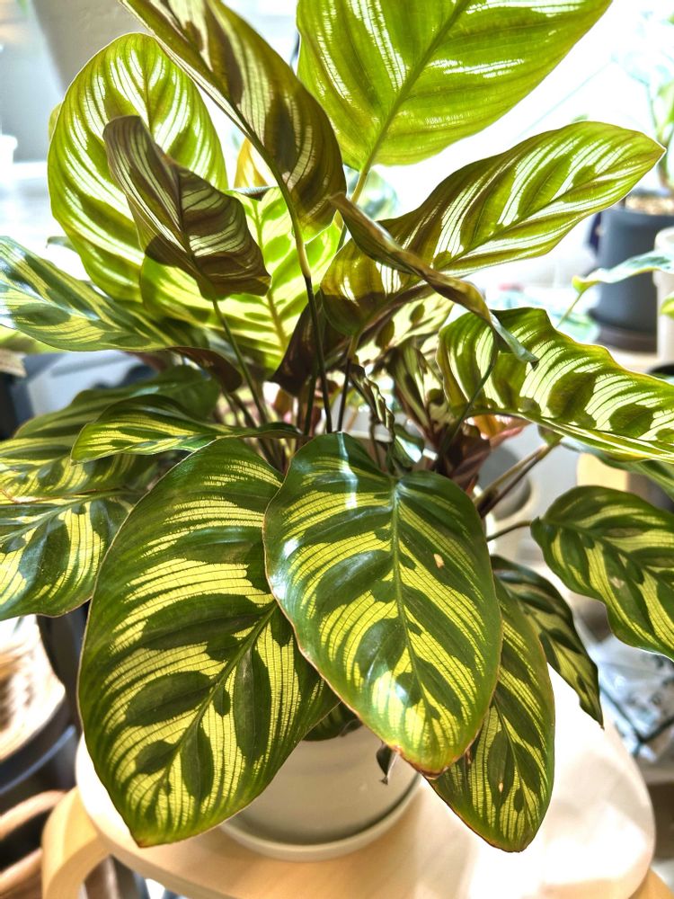お気に入り😃カラテアマコヤナ😊葉っぱが多くなり過ぎて来たので先日に続いて10枚ほど剪定した😊まだ新芽が5本ほど出て来た🫢来年は3回目の鉢増しで7号鉢かな