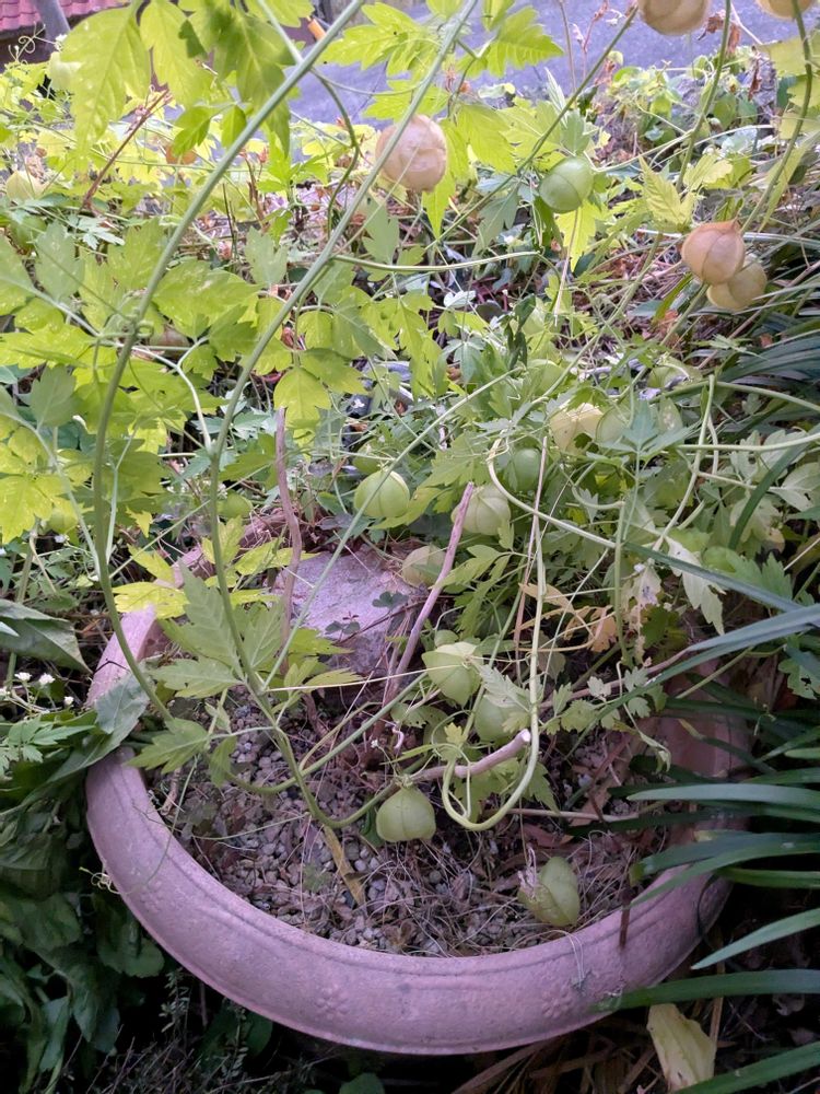 フウセンカズラ種からの毎年咲き始めて、庭中走り巡ってます。足先に当たり、道ふさがれまくり☺️