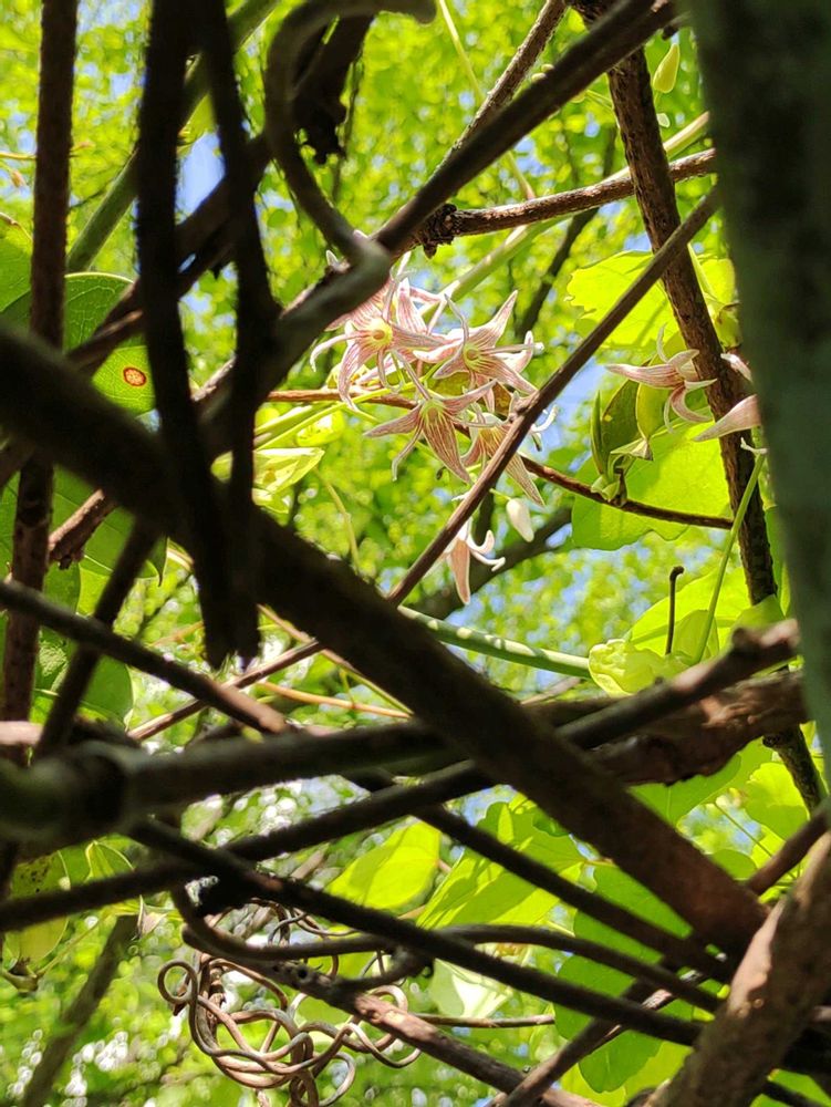 ①マンションの藤棚はフジは咲かないけどムベが咲きます。