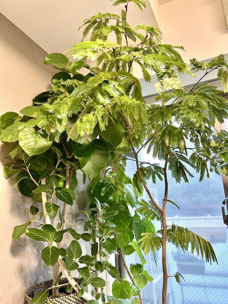 お気に入り😃フィカスベンガレンシスの真っ白な幹が清潔感があって大好き💕❤😘です〜😊エバーフレッシュとウンベラータの優しい葉っぱ☘️も大好きです〜😊