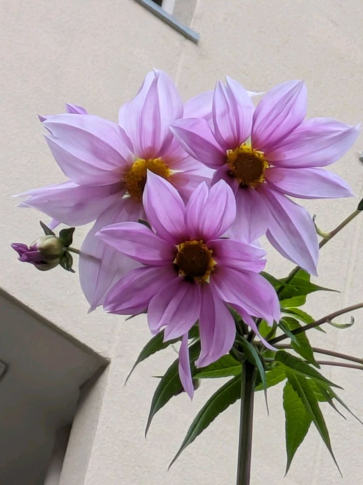 春頃 切られちゃってて無くなったって思った皇帝ダリア でも秋に入ると小さな姿が確認てきて良かったって思ってたら しっかり咲き始めた🩷🌿