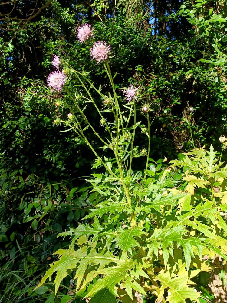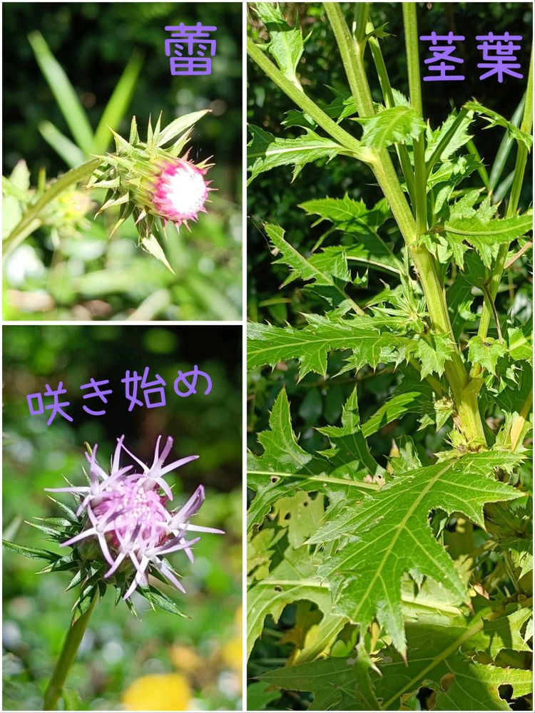 常緑樹林の林縁に生える。草丈50〜150cm。葉はやや肉質で棘が少なく(弱い)、花期には下部の葉は枯れる傾向がある。淡紅紫色の頭花は大きく、重みで斜め下を向くことがある。総苞片は外側に反り返り、先は刺になる。個体差が大きいのも特徴。