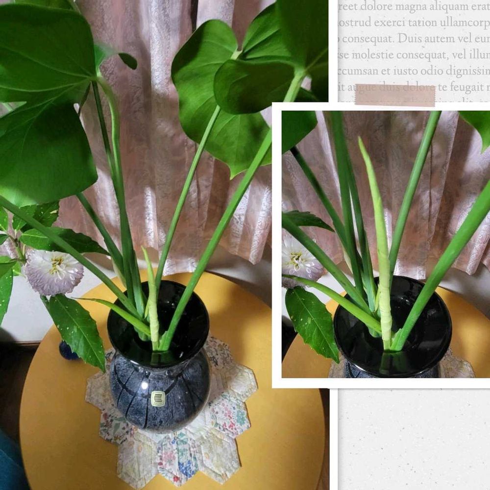 花瓶に株分けしたモンステラとダリアを生けてたら 新芽が出て来ました😲
