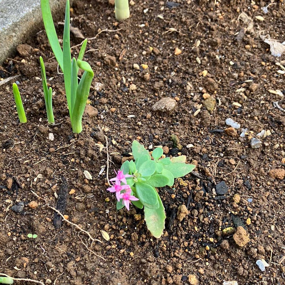 庭の片隅、PWセダムモコランドの挿し芽ポットを地面に降ろしておいたら小さな株に花が咲いておりました♪ 朝から元気出ちゃいます!!