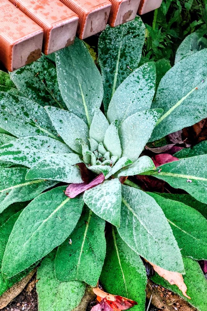 ②ベンチ横にビロードモウズイカの葉が広がってます。伸びて咲いたら座りにくい⋯
