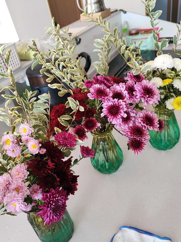 庭の菊がだいぶ咲いてきたのでこれから1ヶ月くらいは菊シーズンになります。どんどん折って切り花にします。もふもふに伸びたプリペット系も剪定シーズンなので枝ごと切って、キレイなところはどんどん枝物として活用します。
