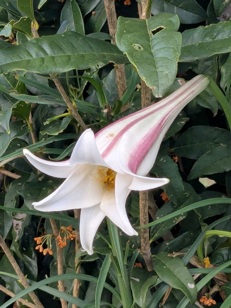余り詳しくないのでGoogleレンズで見たらテッポウユリとありましたのでアップしたのですがテッポウユリでググったらテッポウユリは白い花で赤い筋はなかったですね✨慌てものなのでよくやります😆😅
