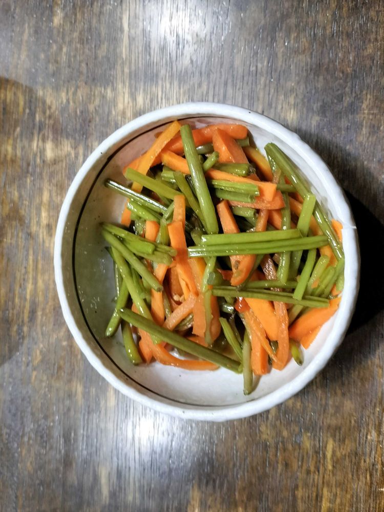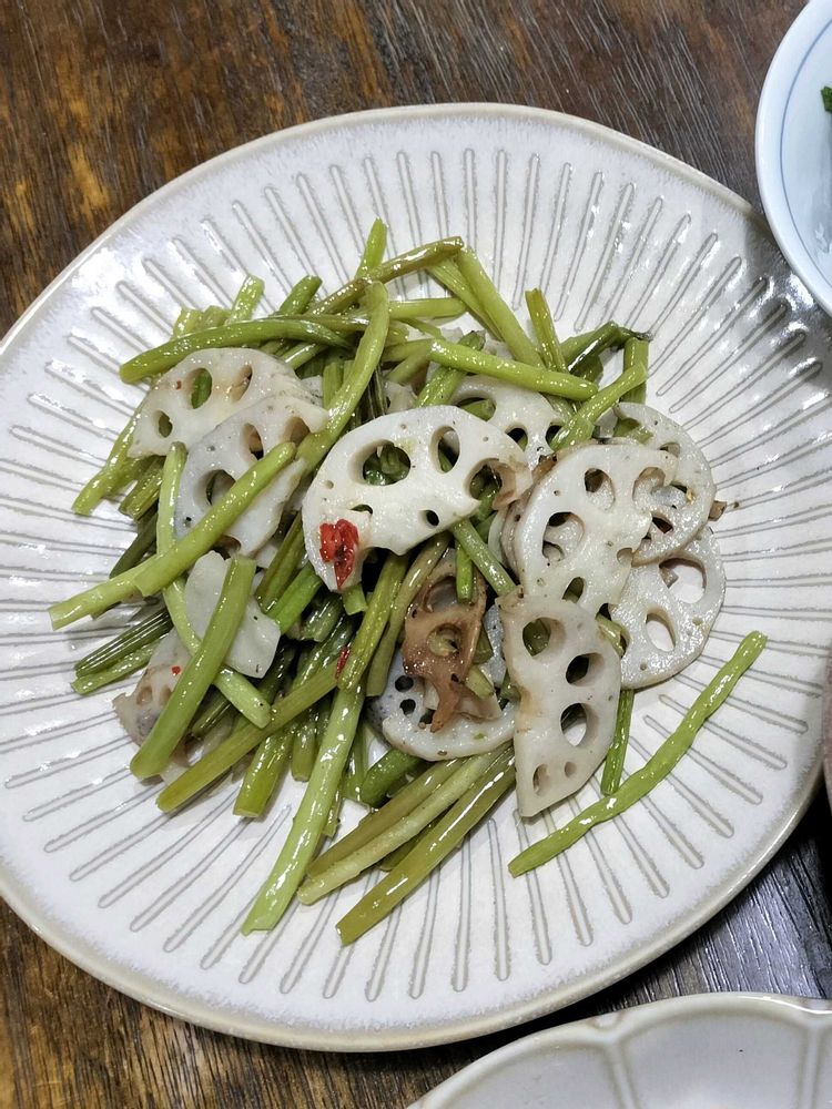 4️⃣さつまいものツルとレンコンペペロンチーノ風