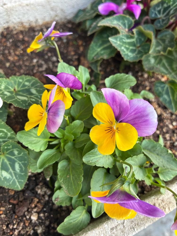 道路沿いの花壇にて、ピンク色の「バラ」や「シクラメン」、紫色の「ビオラ」や「ヨメナ」をパチリ!📸🩷💜🌿😊😄🤗🌞✌️