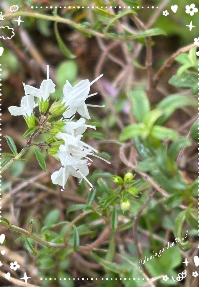 ①昨年寄せ植えに入れた ハーブのウィンターセイボリーの蕾が出てきてお花が咲きました🤍💚