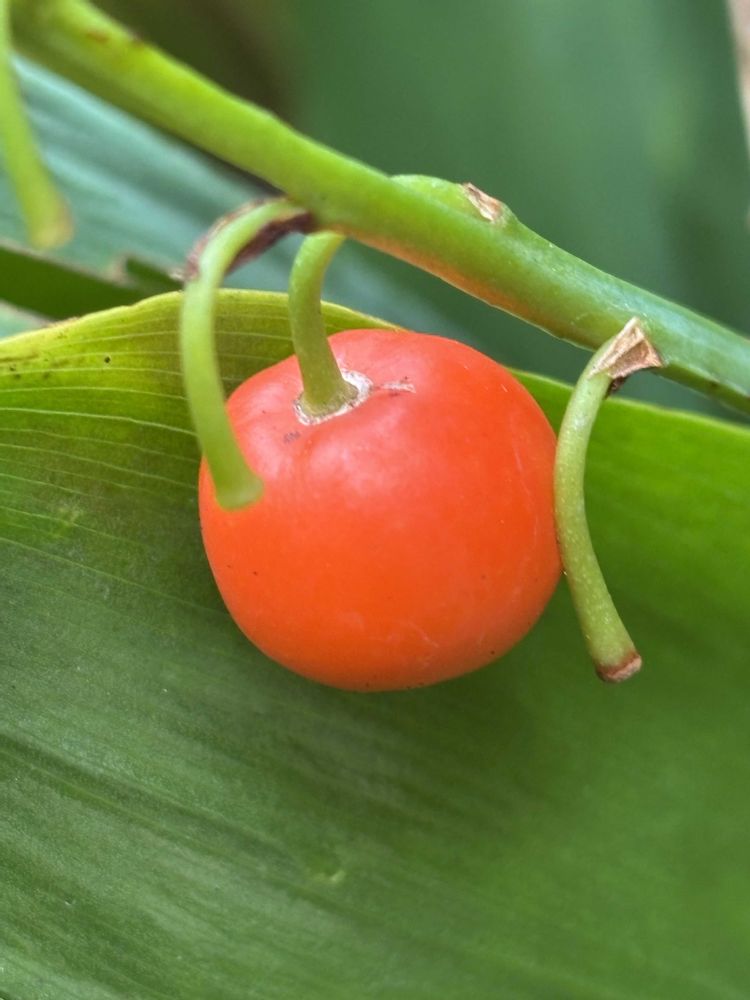 先日、花壇の整理をしようと杜鵑草(ホトトギス)の林をハサミ✂️でチョキチョキ刈り進んでいったら、ドイツ鈴蘭(ドイツスズラン)の実を見つけました。まん丸の赤い実です😄