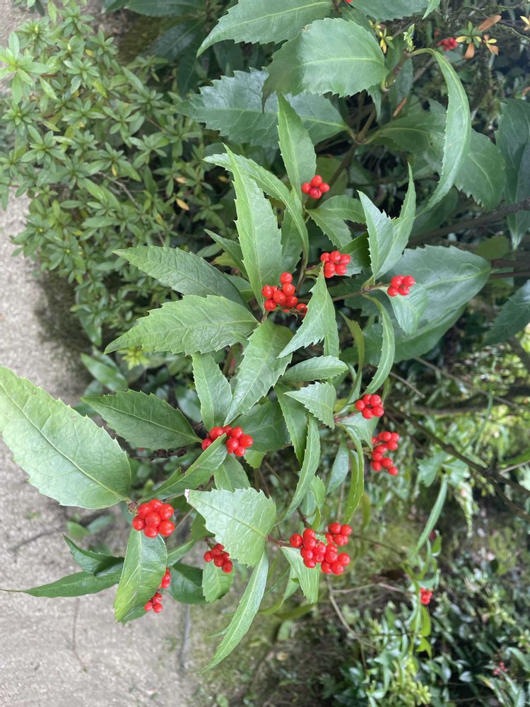 ① 千両の実が赤くなり、葉っぱと綺麗🔴🌿
