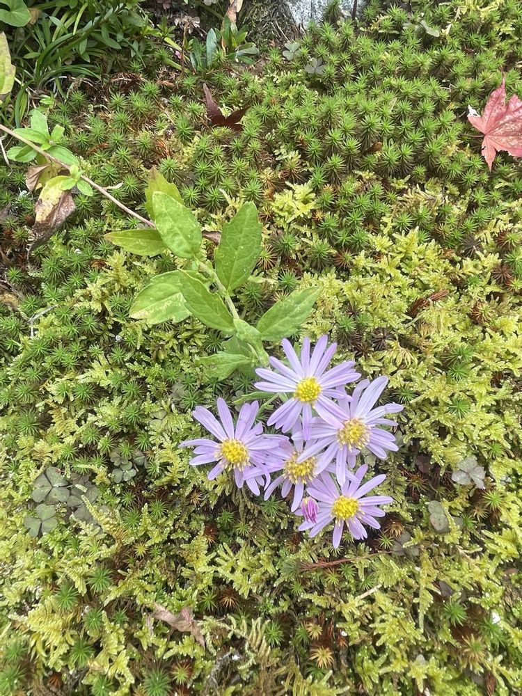 ⑤ 苔の上に 茎が伸びてきて ??の花が 清楚な感じで風情がありますね😉 シオンかなぁ?