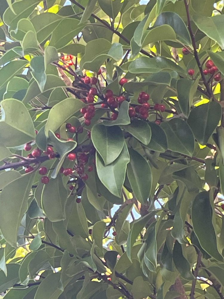 ②③赤繋がりで、我が家の赤い実たち。クロガネモチと鳥さんの落とし物万両の実。