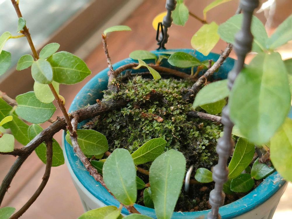 根元にはテラリウムで使っていた時の名残の苔が良い感じに生えていたので残して植え替えしました。