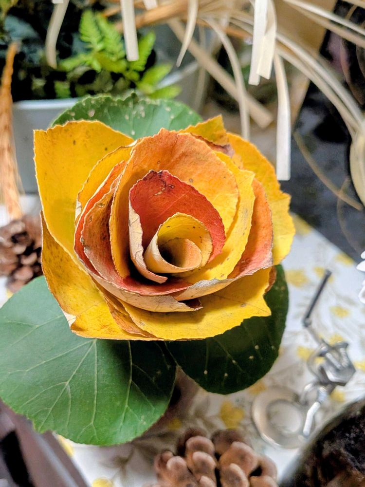 ハマボウの黃葉の葉で🌹薔薇をイメージして作りました…難しい😟