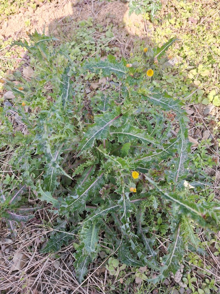 とても成長が早く環境に強い雑草のようです。葉が硬く縁がトゲっぽく触ると痛いです。茎も硬くしっかり根付いています。分かる方いらっしゃったら教えて下さい。
