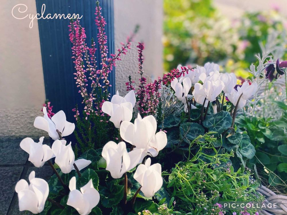 白いシクラメンとピンクのカルーナを寄せました🤍🩷🍃
