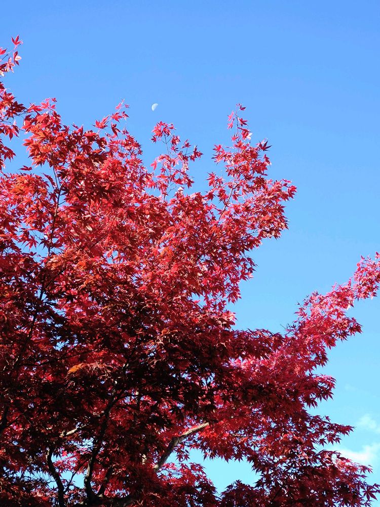 真っ赤な紅葉🍁と、青空に浮かぶ白い月綺麗やね🎵