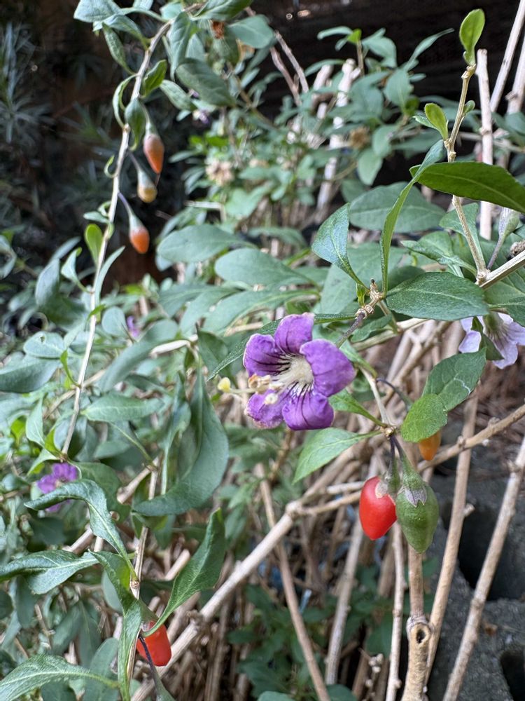 ④家のクコのお花が咲くのは珍しくないんだけど、赤い実がなっていてびっくり‼️私は初目撃で、夫は「何年も昔に、もっとたくさん実がなったことがあった。」って👀フーン シランシー