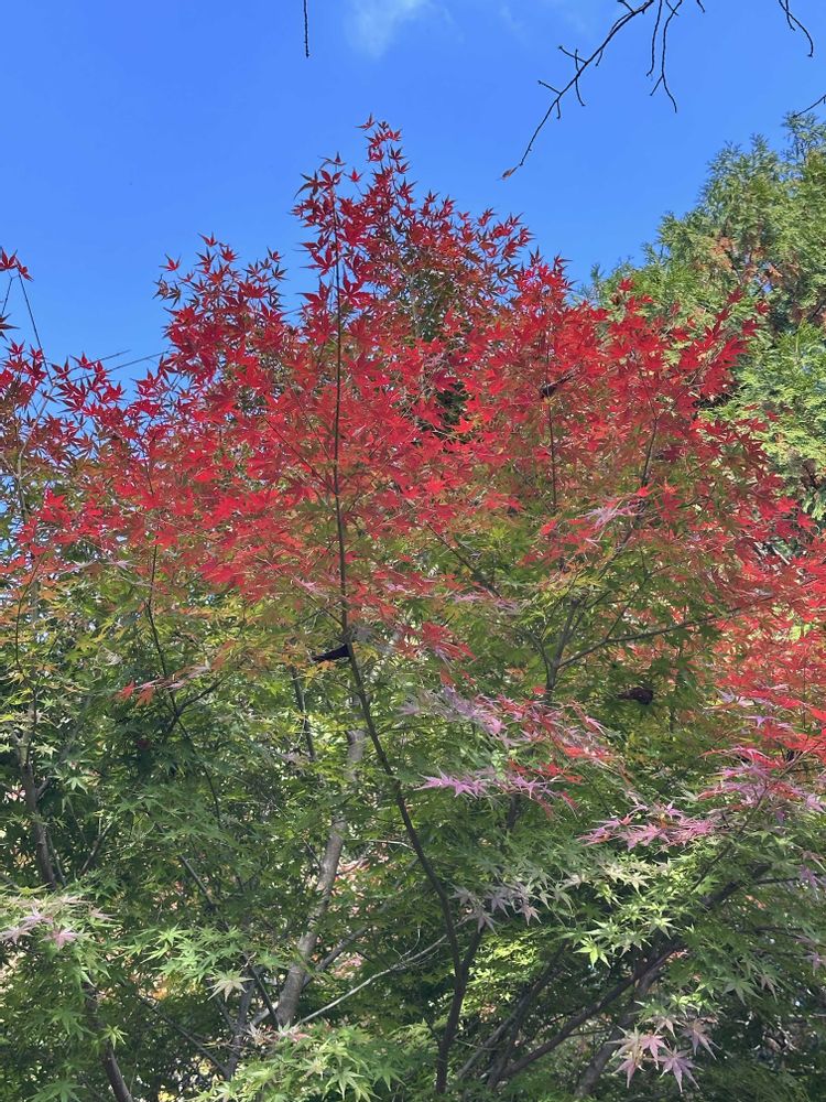 一本のモミジの木に濃い緑のモミジ葉と真っ赤に染まったモミジ葉とのコントラストが真っ青の空に映えてました。