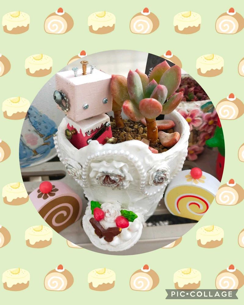 🍓のアイスコーン鉢とチョコのアイスコーン鉢の上にゆき。さんに頂いたいちごみるくロボたん🤖💕💕