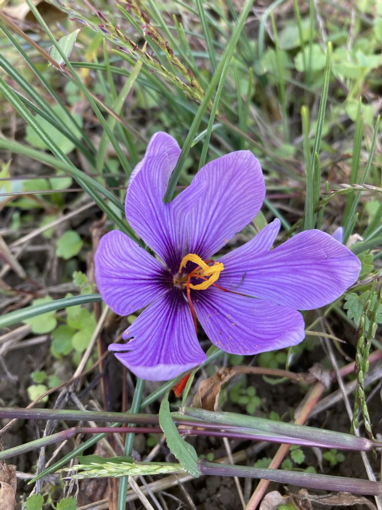 見たことのない花がひとつだけ咲いていた。調べたら「サフラン」と出た。どこから来たの?