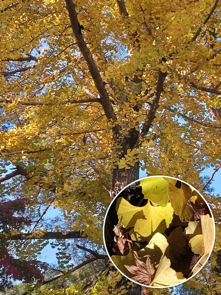 ゆっくり歩いて行くとモミジ🍁が真っ赤になってるとこも、銀杏も光で神々しい光に凛と立っているイチョウの木も……❣👏👏👏
