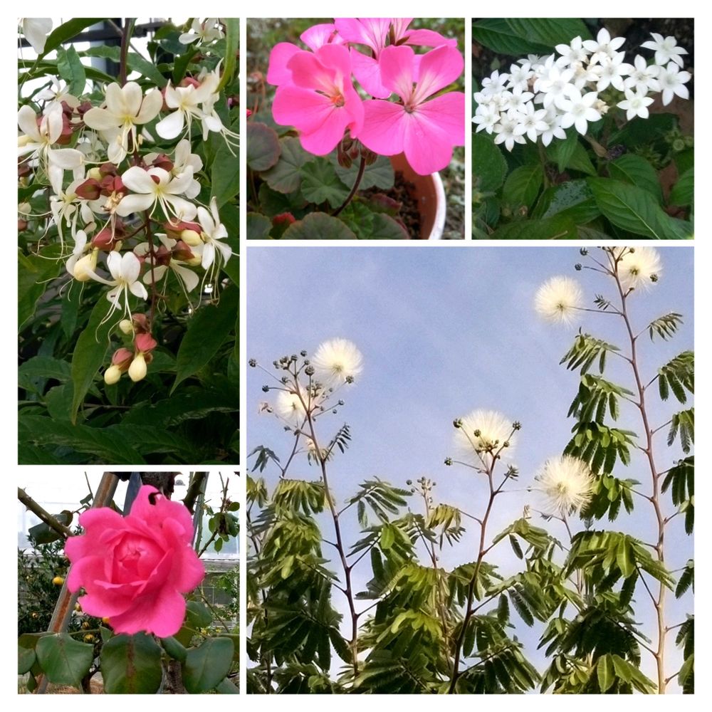 左から、ご近所さんのクラリンドウ🤍、我が家のゼラニウム💗、花友さんのお庭のペンタス🤍、そして白いネムの木🤍、ピンクのバラ💗は、散歩中に見つけました💕