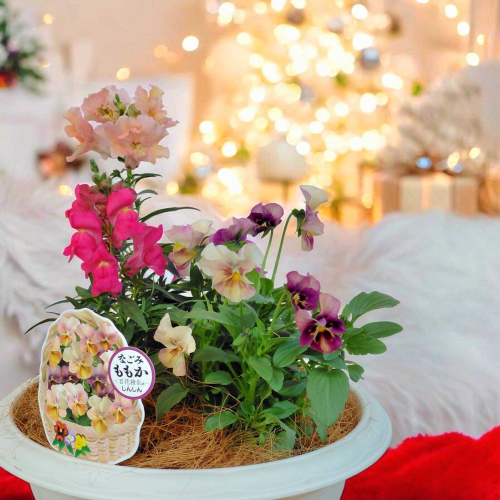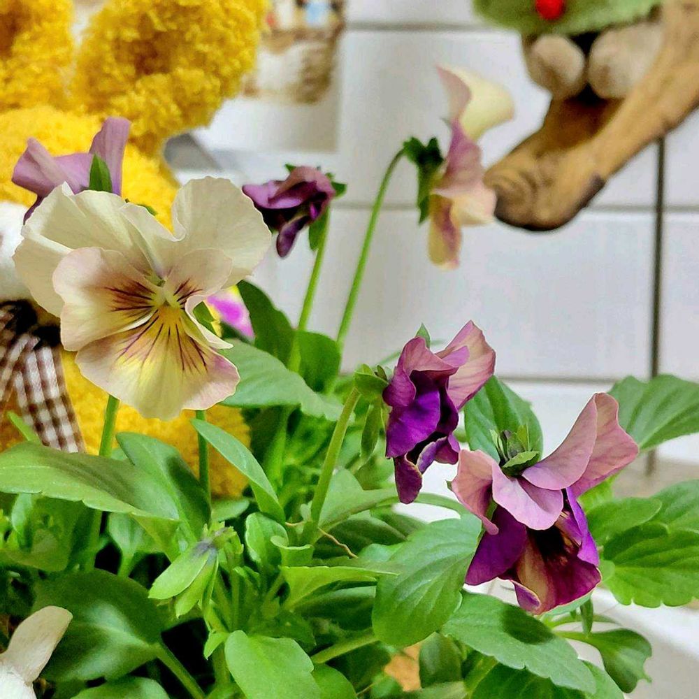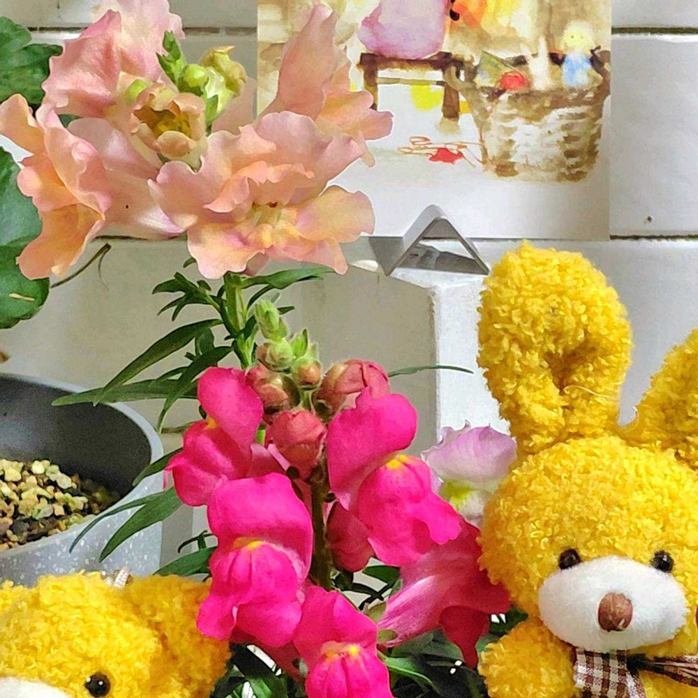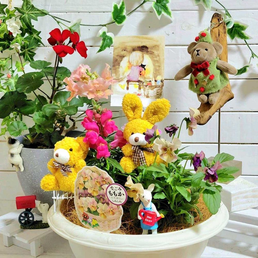 可愛らしいビオラさんとキンギョソウさんの寄せ植えにクマさんとウサギさんの縫いぐるみも飾って楽しそうですね~💜❤️🩷🧸🐇:.* ♡(°´˘`°)/ ♡ *.:*⃝̣◌⑅⃝◍♡