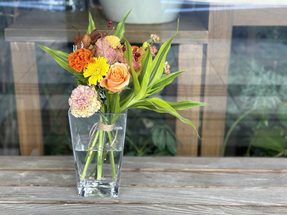 使用した花材=ドラセナ、バラ、カーネーション、ガーベラ、ケイトウ、落葉、実