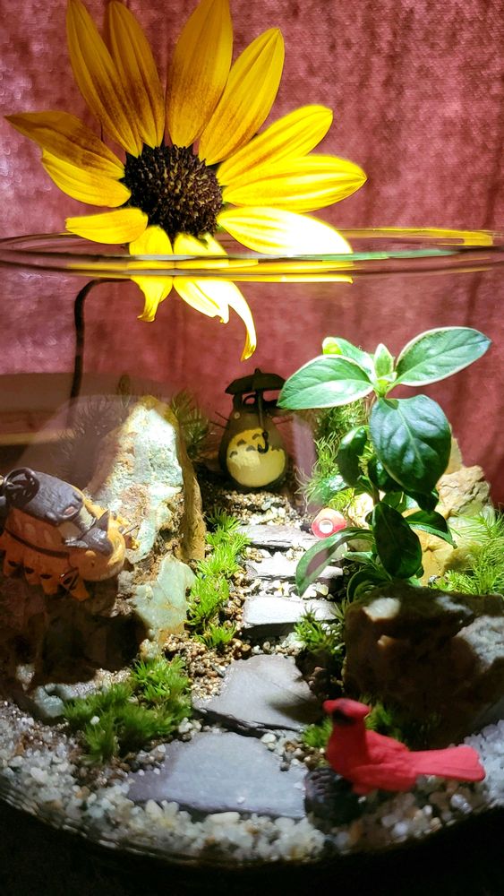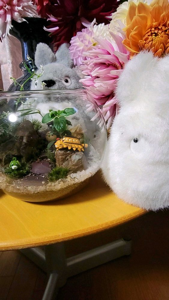 7月にワークショップ 先生が指導して教えてもらいピンセットで苔を1本づつ植えました(大変でした😥)一緒に習った人のを見ると私のは物足りなく淋しい感じだったので 家に有った時 トトロ&ネコバス 昔ペットボトルのおまけの🐶を居れてます!