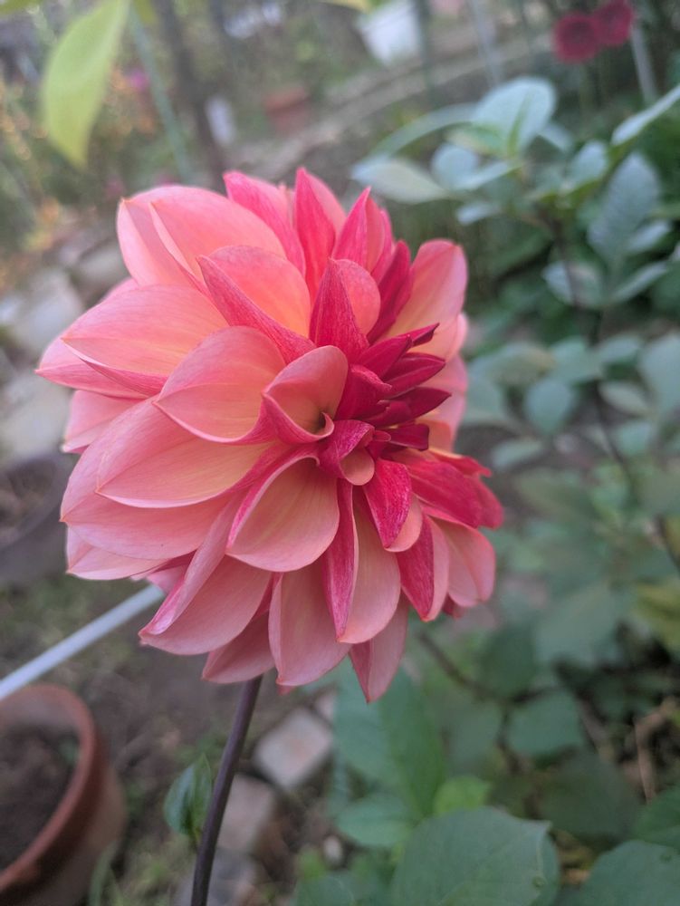 ダリア アンティークロマン 真っ赤から咲き進むと、薄いピンクオレンジが出てきます。