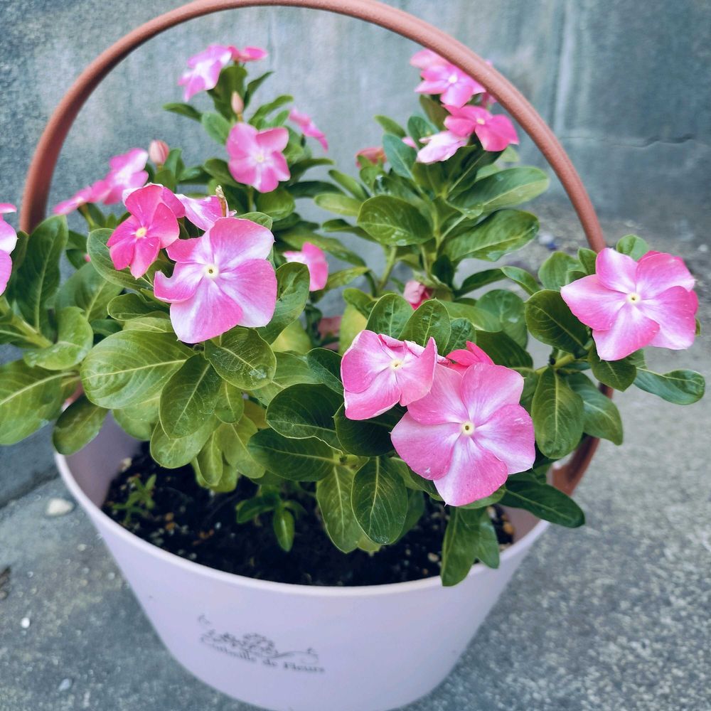 ニチニチソウとストックのピンクが癒やしになって嬉しいです🍓