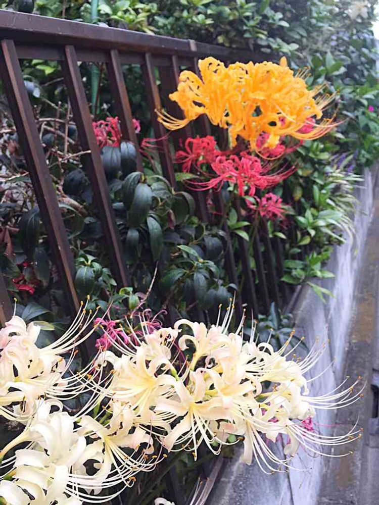 ご近所の庭から、ちょっと珍しい白いヒガンバナが顔を出していました✨