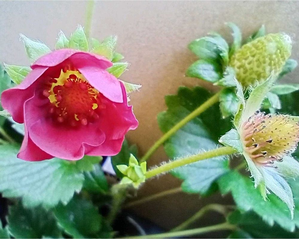 いちごの花って白のイメージでしたが、赤もあるのですね😳