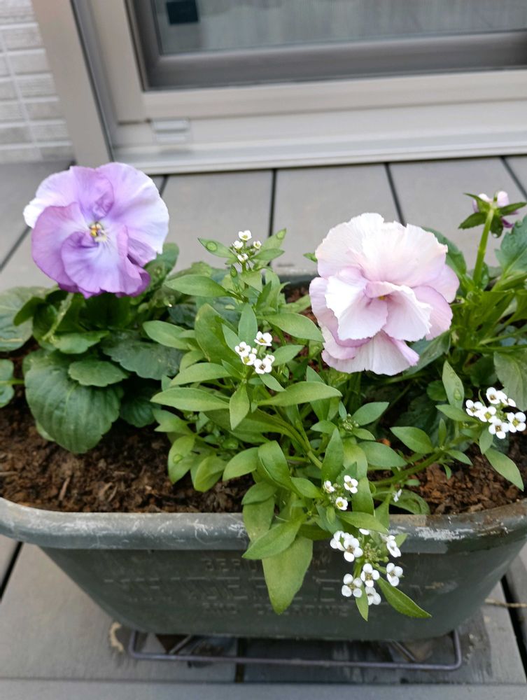 フリル咲きパンジーとアリッサムで寄せ植え作ってみました。