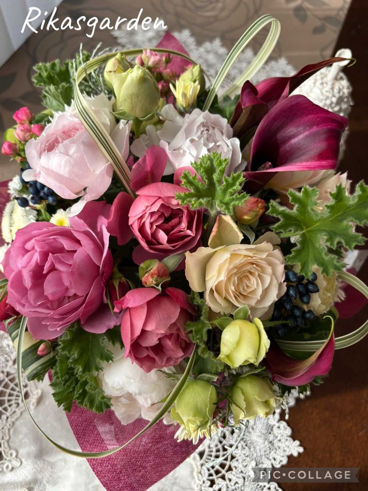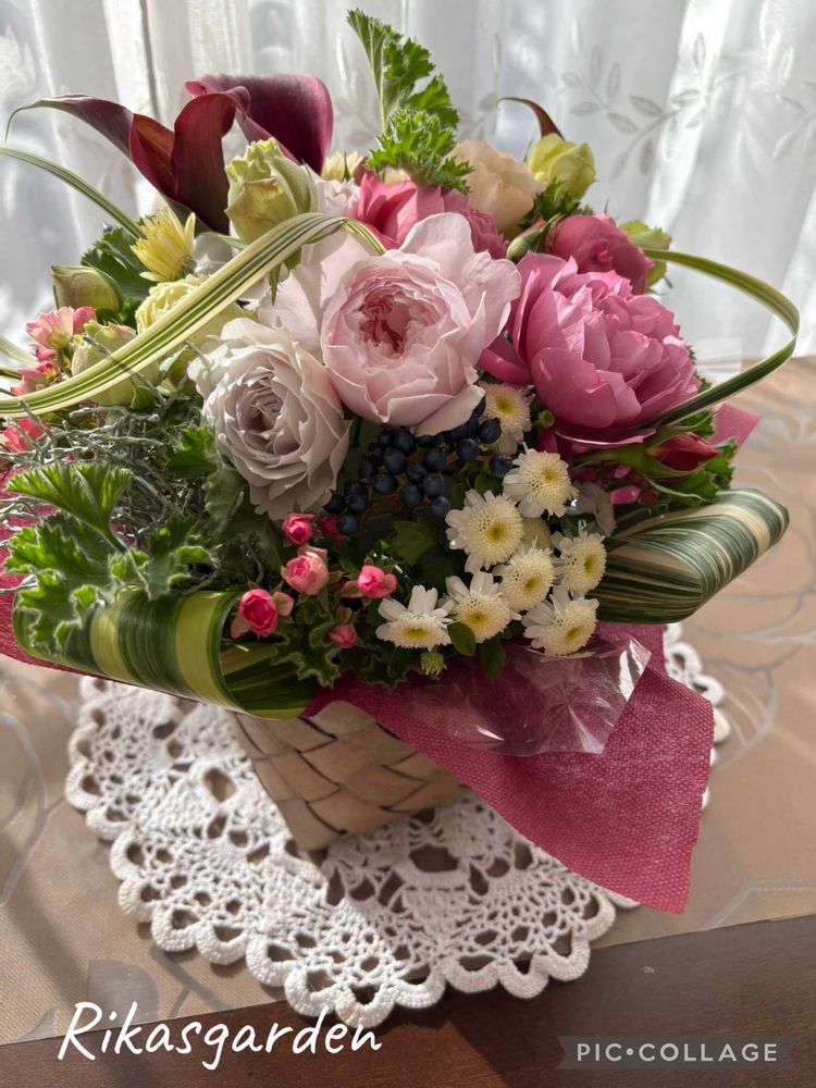 ①今日は、ご近所のお友達から、お義母さんのお誕生日プレゼントにアレンジメントを作って欲しいとご依頼があり、庭から私の好きな花を切ってきて、私の好きな色合わせで、心を込めて作らせて頂きました。