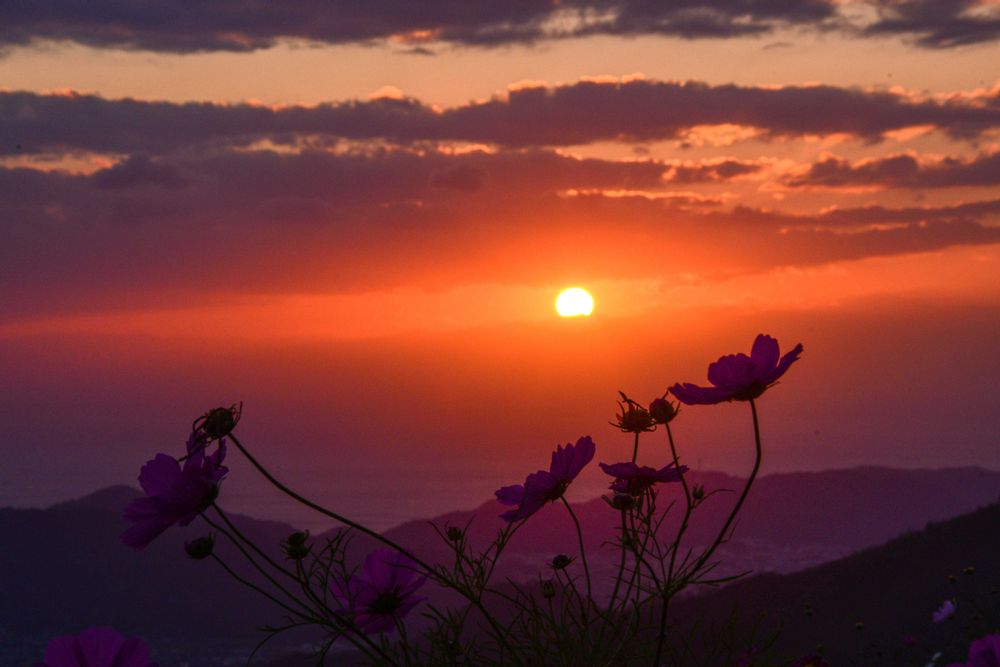 夕焼けの中に浮かぶコスモスが素敵!影絵のよう🌸🌸🌸