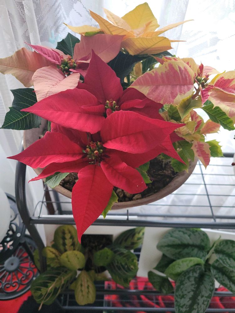 ポインセチア小さな苗を色違い鉢植えに🤭可愛い💕