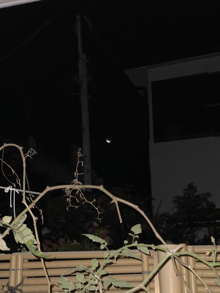 ②枯れ感漂うトマトの枝越しに朝の三日月🌙