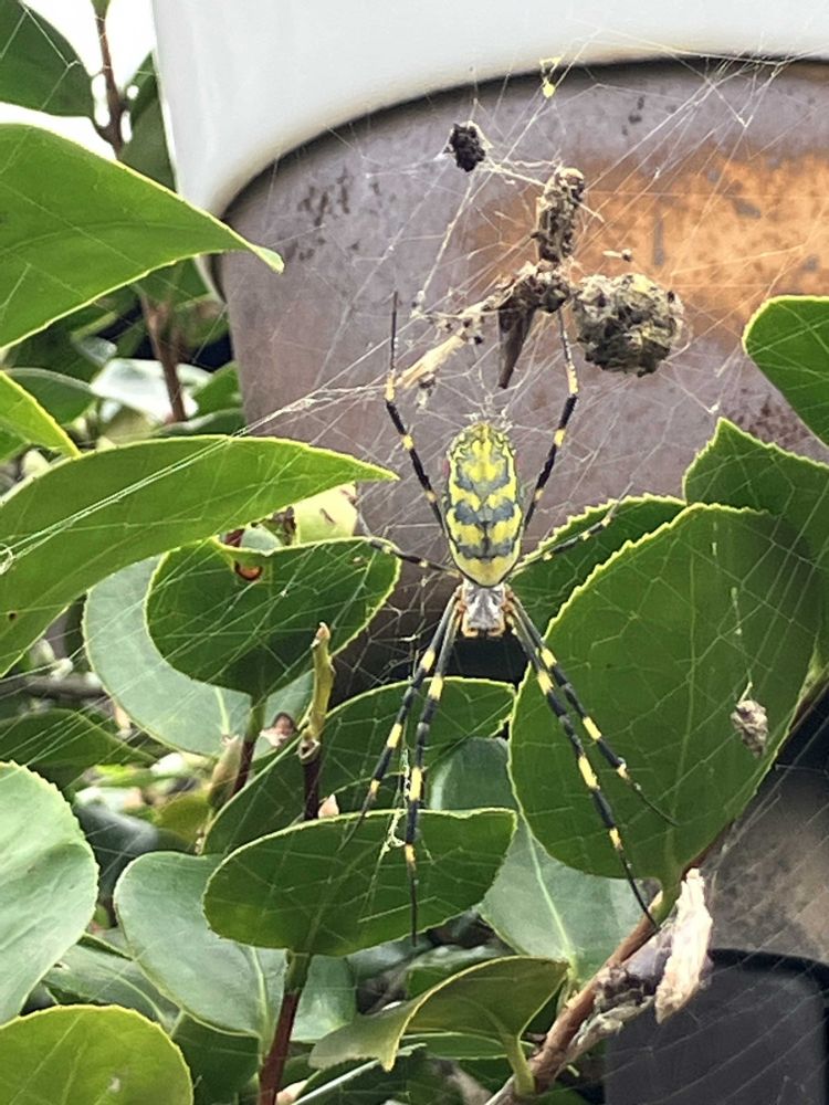 ⑤コガネグモが高い位置に巣を掛けています 女郎蜘蛛かと思ってましたが違いました😄