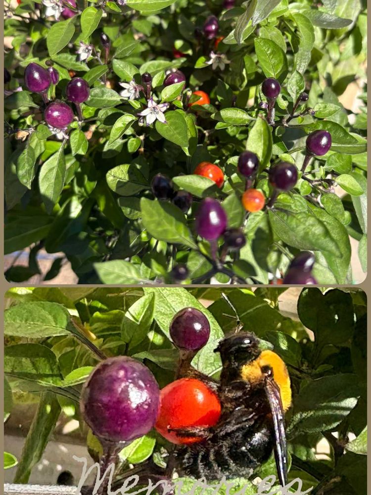 7月に来たワンコイン寄せ植え4ヶ月目の今日、ニチニチソウはカットしてしまったが⭐️ペンタス⭐️サルビア⭐️観賞用トウガラシ🌶️まだまだ元気☺️と見てたら👀👀またまたお客さんがトウガラシに捕まってる🤣大きなクマバチ😅